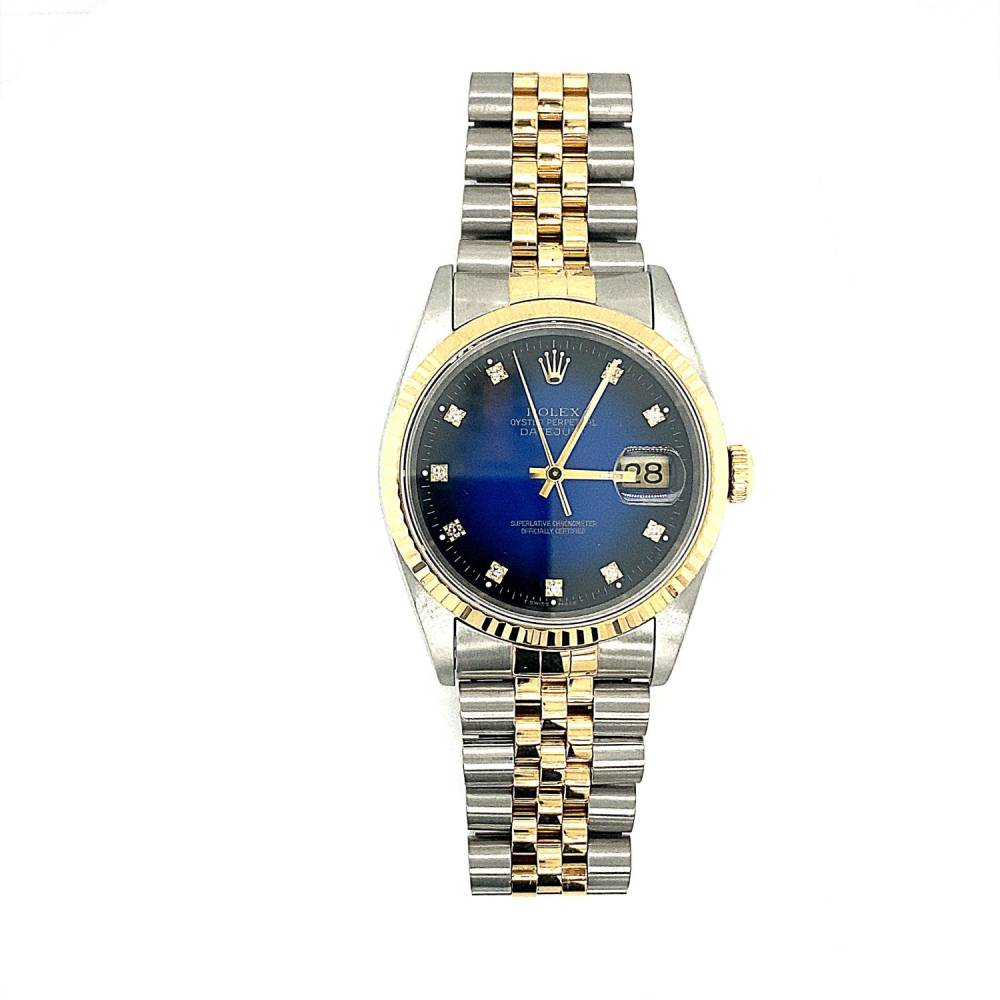 Pre Owned Rolex Datejust watch. Steel and 18ct gold with a blue degrade diamond dot dial and fluted 18ct gold bezel. Jubilee steel and gold bracelet. Year 1992. This watch comes with the original papers and a box.