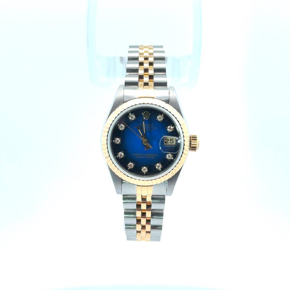 Ladies Steel and Yellow gold Rolex Datejust on Jubilee bracelet. Blue vignette diamond dot dial. Papers and generic box. Model 69173. Year 1992.