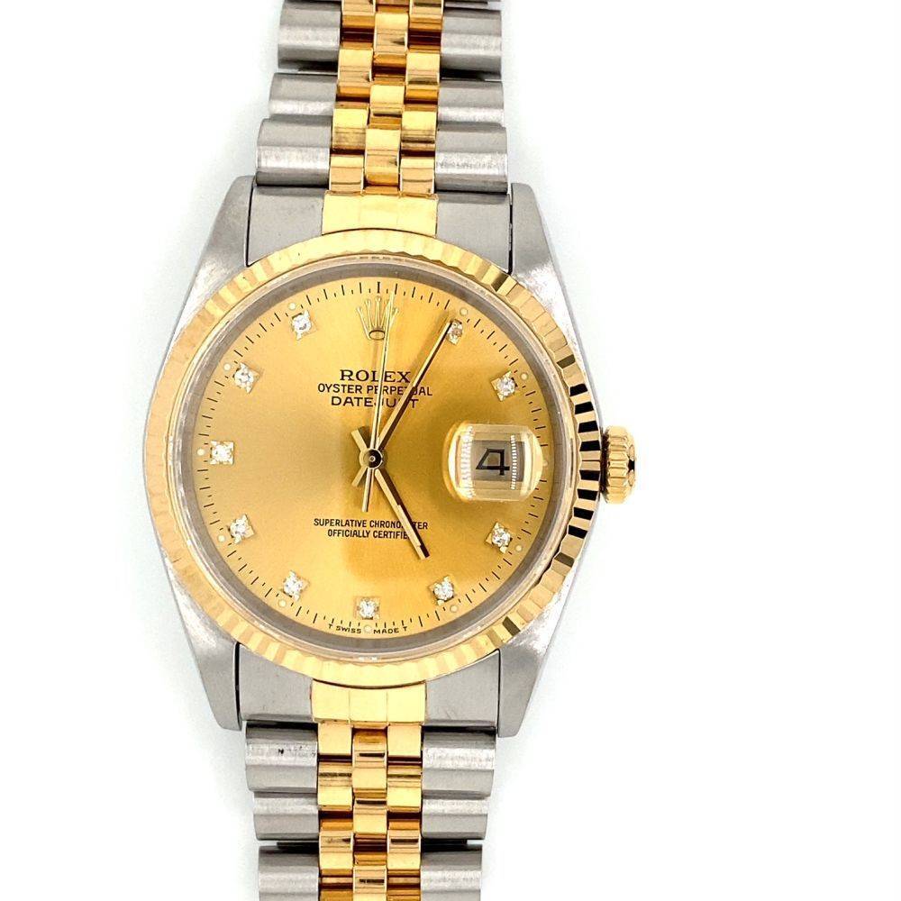 Pre Owned Rolex Datejust in steel and 18ct yellow gold. Round champgane diamond dot dial with a yellow gold fluted bezel on a two colour jubilee bracelet. year 1991. This watch comes with the original box and papers. Powered by a superlative automatic chronometer movement. This watch has been fully refurbished which includes servicing of the movement and refinishing the bracelet and comes with our one year warranty. This watch has been subject to due dilligence checks with the Watch Register.