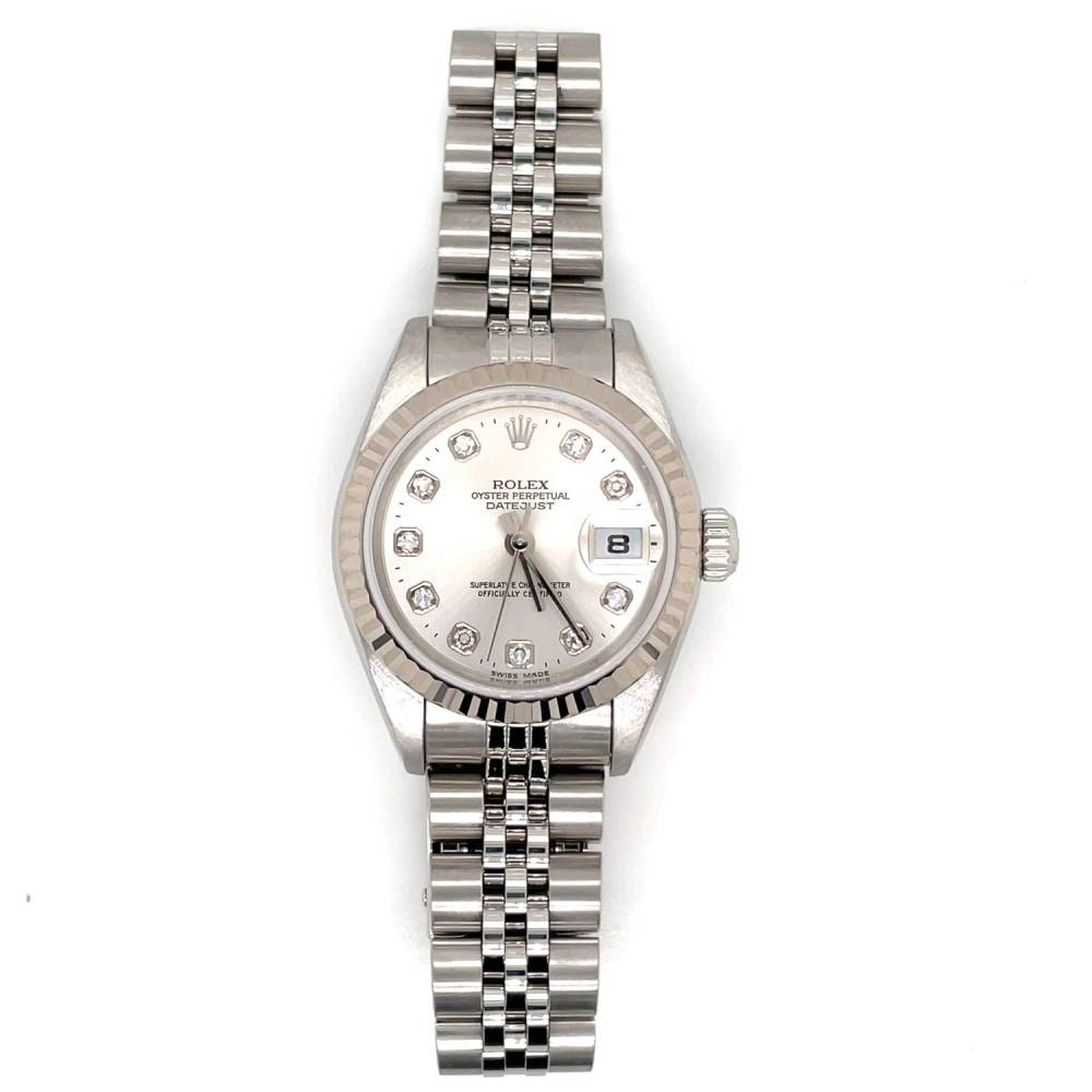 Pre owned Rolex lady Datejust. Silver diamond dot dial with a white gold fluted bezel on a jubilee bracelet. This watch has been fully serviced and comes with a one year warranty. Original papers and a box. Year 2001.