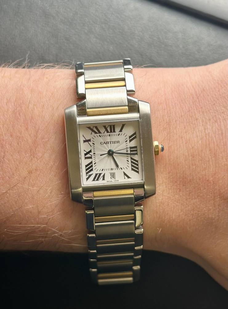Pre Owned Cartier steel and gold mid size Tank Francaise. The signature Cartier synthetic cabachon spinel crown with a white roman numeral dial and two tone steel and gold bracelet. Double deployment catch. Automatic movement. This watch comes with the original box.