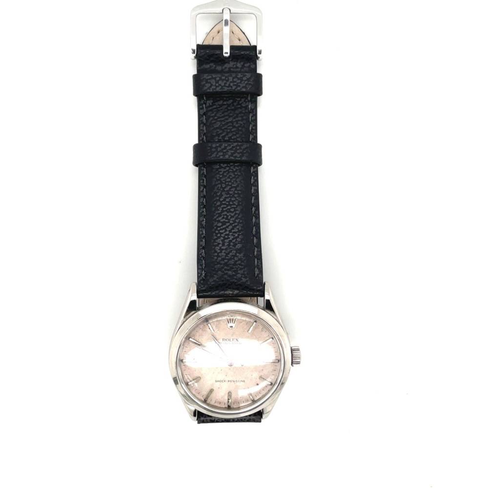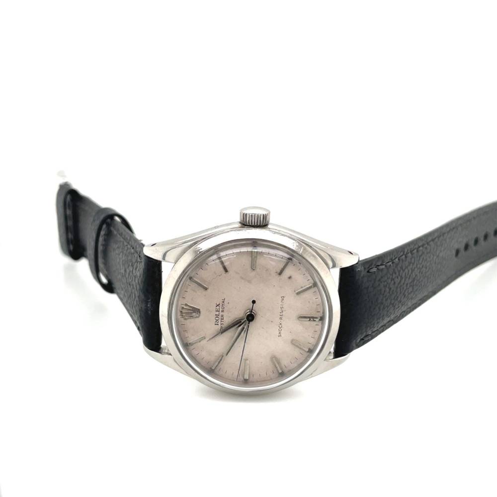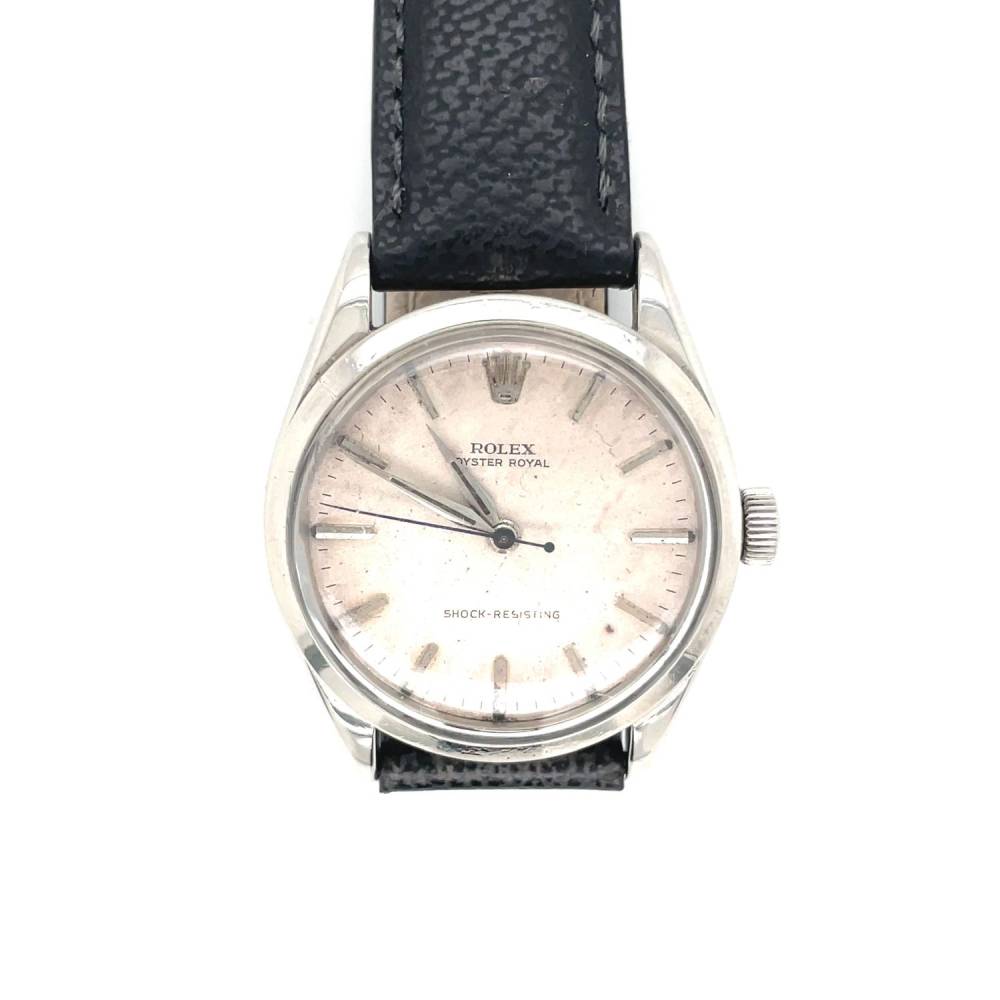 Pre Owned vintage stainless steel Rolex Oyster Royal watch. This watch has an automatic movement which has been serviced and comes with a one year warranty. White baton dial on a new black leather strap. This watch is from 1958/1959. No original papers and a generic box.