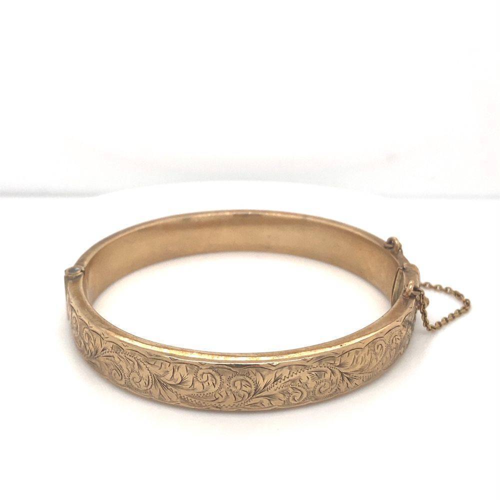 Preowned 9ct yellow gold half engraved bangle with a hinged catch and safety chain. Weight 13.8g. Dimensions external 66 x 58mm.