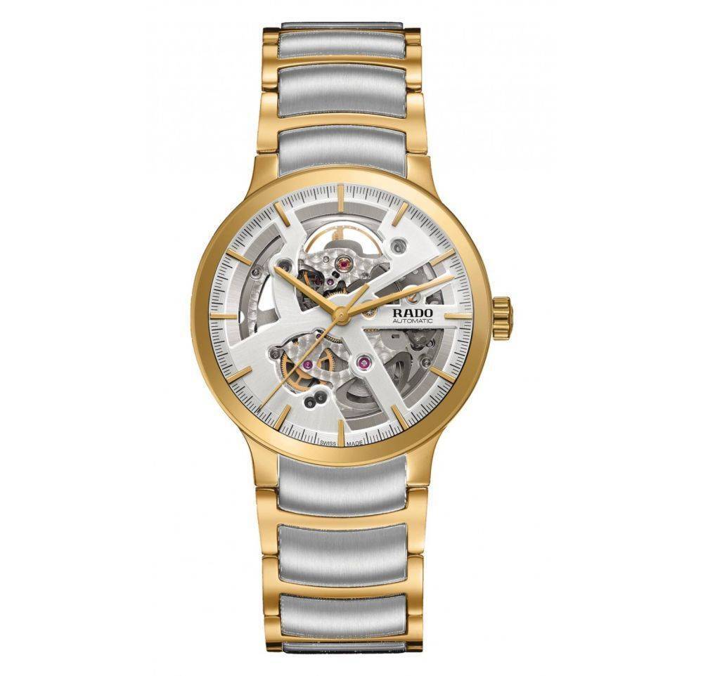 Rado gents stainless steel and gold plated Centrix watch with a round skeleton dial, allowing you to see the workings of the watch finished on a stainless steel and gold plated bracelet. This watch has a self winding automatic movement.