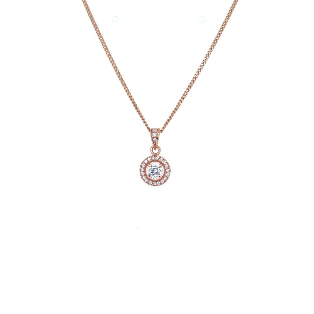 Silver rose gold plated round cubic zirconia halo pendant on a rose gold plated 18″ chain. Matching earrings available.
