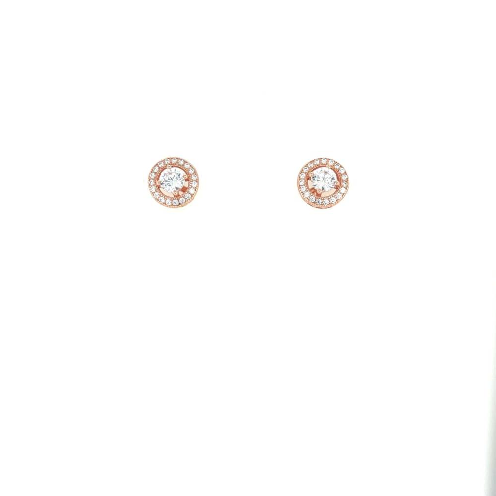 Silver and rose gold plated round cubic zirconia halo stud earrings. Matching necklace available.