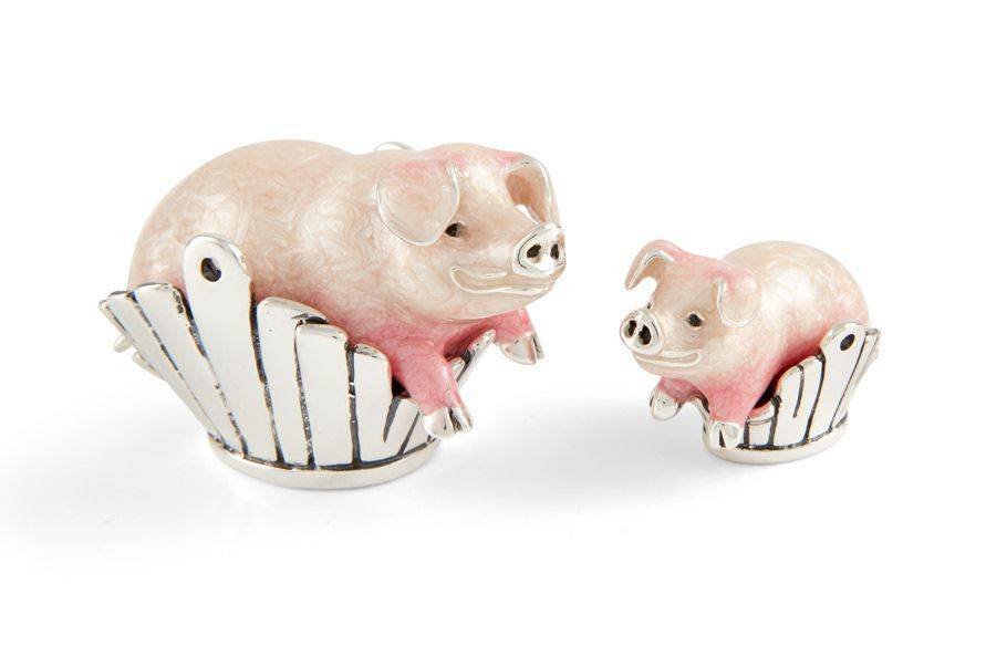 Saturno sterling silver and hand enamelled pig in a basket. This is the small size, on the right hand side of the image. This figurine has been beautifully made in sterling silver and hand enamelled. Then the animals are lacqured to help prevent tarnishing. Width 18mm, Height 22mm.