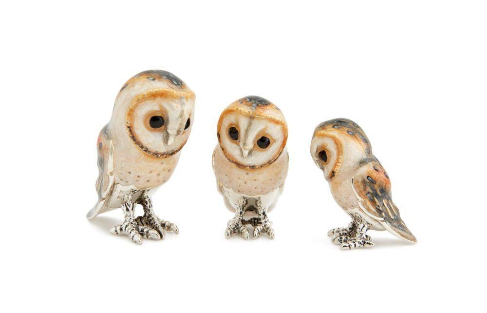 Sterling silver and enamel small barn owl figurine. This figurine has been beautifully made in sterling silver and hand enamelled. Then the animals are lacqured to help prevent tarnishing. This owl is the smallest size which is the one on the right hand size of the image.