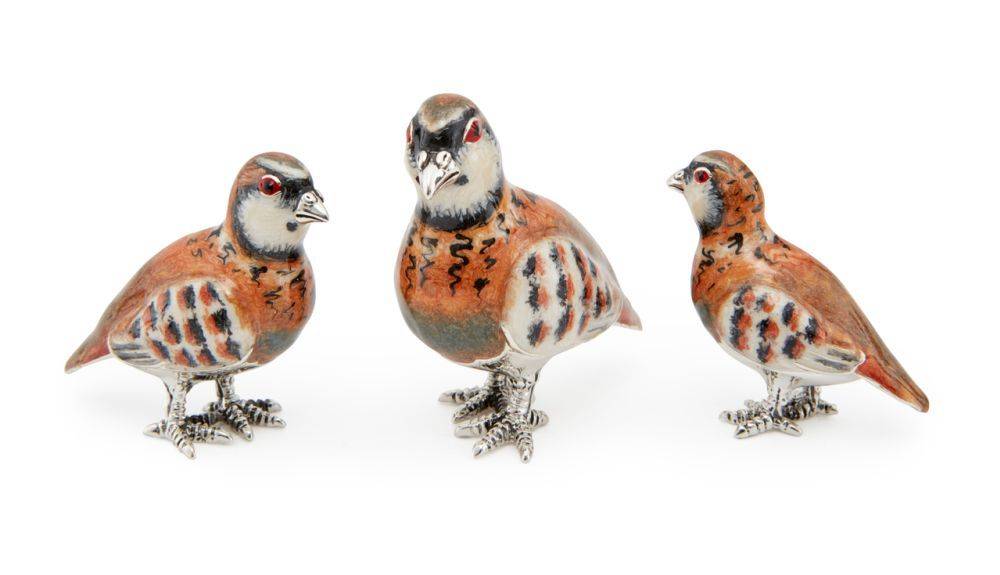 Saturno sterling silver and enamel small partridge. This is the partridge on the right hand side of the image. Height 43mm. This figurine has been beautifully made in sterling silver and hand enamelled. Then the animals are lacqured to help prevent tarnishing.