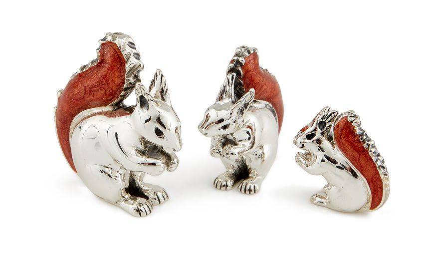 Saturno sterling silver small squirrel with an enamel tail. This is the squirrel on the right hand side of the image. This figurine has been beautifully made in sterling silver and hand enamelled. Then the animals are lacqured to help prevent tarnishing. Height 20mm.