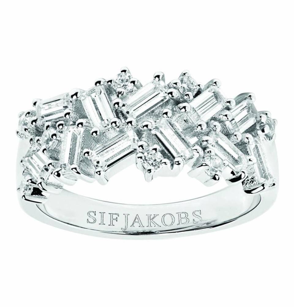 Ring made of 925 Sterling silver with rhodium, polished surface and a combination of facet cut white zirconia and baguette zirconia.