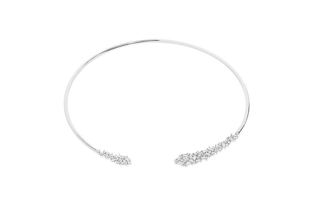 Sif Jakobs sterling silver Antella necklace ring with sparkling baguette cut cubic zirconia. Designed to be worn as a neck ring on the collar bone. Diameter 14cm.