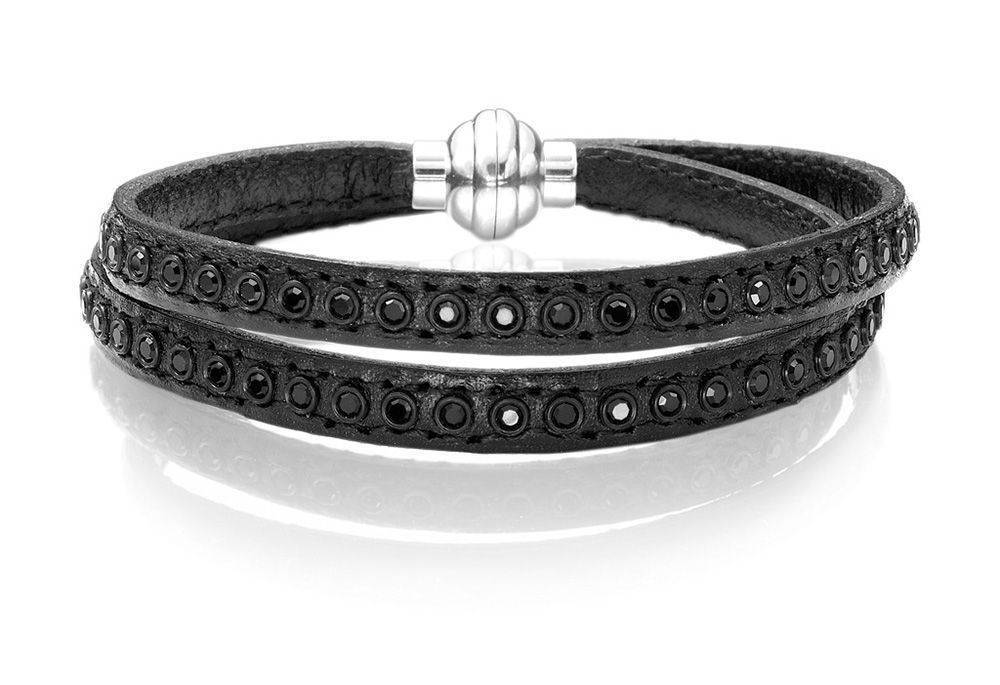 This Sif Jakobs black leather 38cm bracelet wraps around the wrist twice and is set with black sparkling cubic zirconia stones and has a stainless steel magnetic catch.