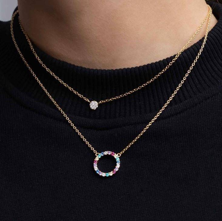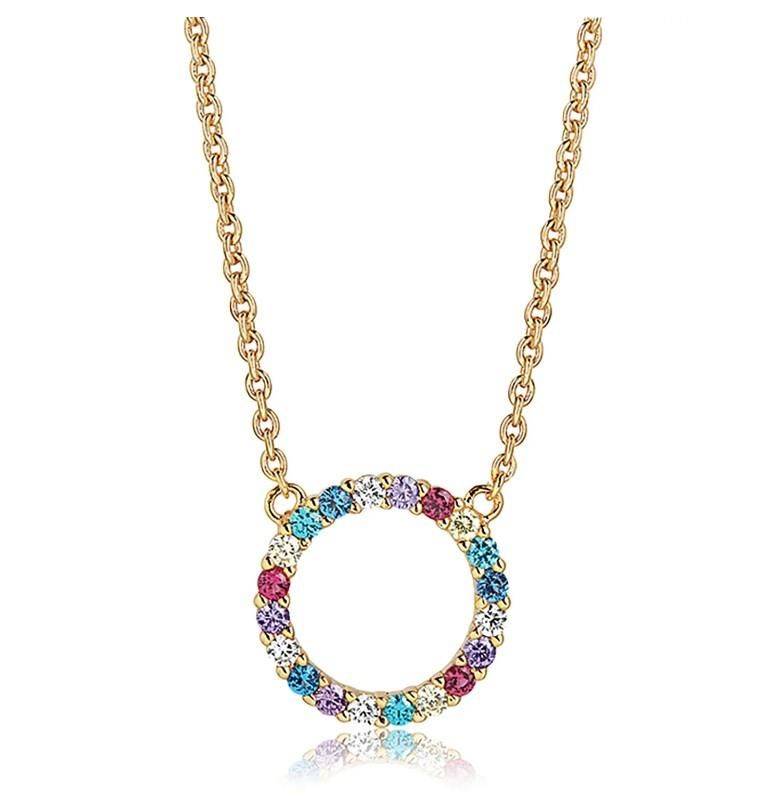 Necklace made of 18 karat gold plated 925 Sterling silver, polished surface and facet cut multicoloured zirconia.