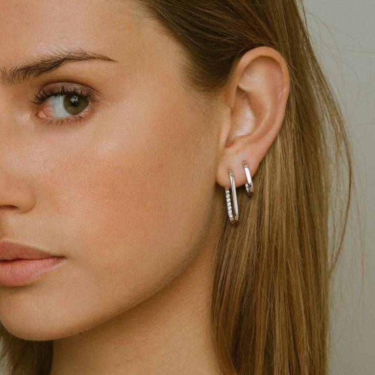 Earrings made of 925 Sterling silver with rhodium, polished surface, and hand set with facet cut white zirconia.