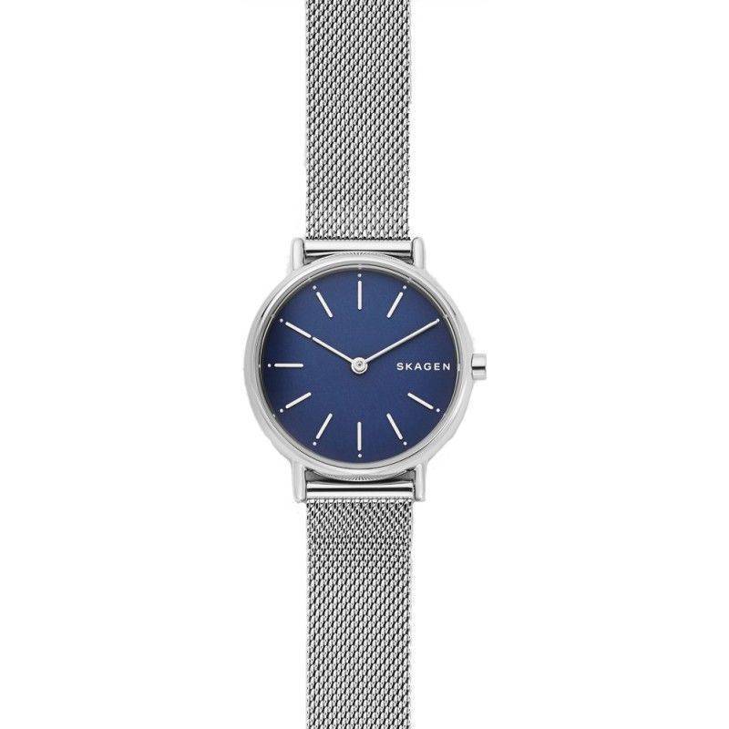 Skagen ladies stainless steel Signatur watch with a classic blue baton dial on a stainless steel mesh bracelet.