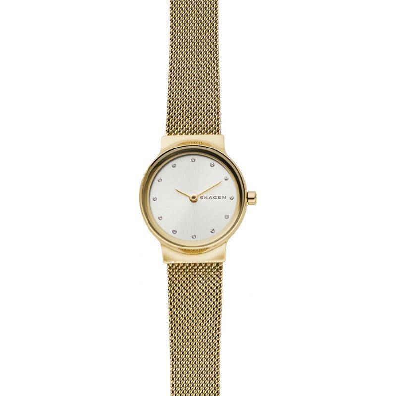 Skagen ladies yellow gold plated stainless steel Freja watch with a round silver dial set with sparkling stones on a yellow gold plated stainless steel mesh style bracelet. Case 26mm.