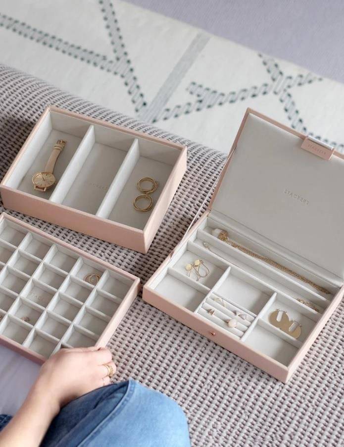 Stackers blush pink faux leather and velvet jewellery box with three layers. There’ll be no excuse for your favourite jewellery to be anything other than tangle-free and organised! The classic set is the ideal starting point and includes the Jewellery Box Lid, the Trinket Layer and the Watch/Accessories Layer.
