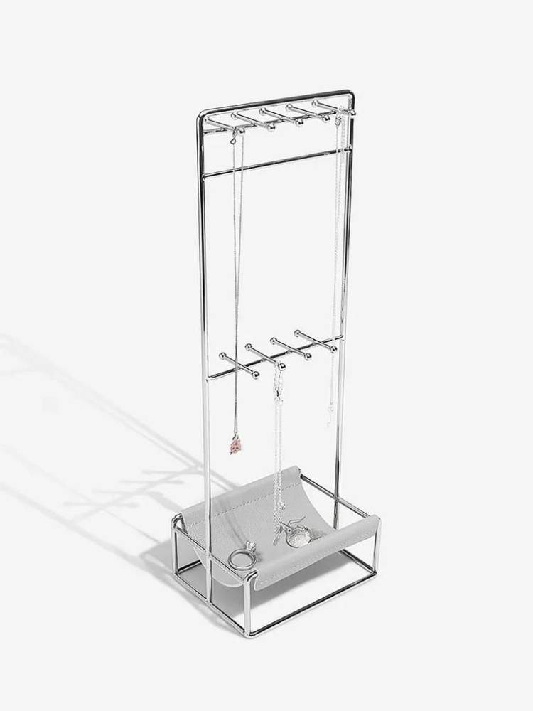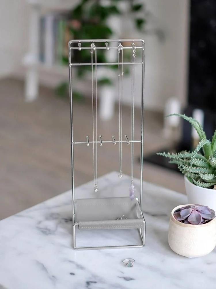 The Perfect pairing for your jewellery. Keep your favourite jewellery items on display with this beautiful faux leather jewellery stand. With hooks at varying lengths to hold chains, earrings, and rings plus additional storage in the scoop base, you can ensure all your jewellery is safe and organised. A stylish, yet practical, addition to any dressing table or shelf. Faux pebble grey leather and chrome. Height 34cm, width 12cm.