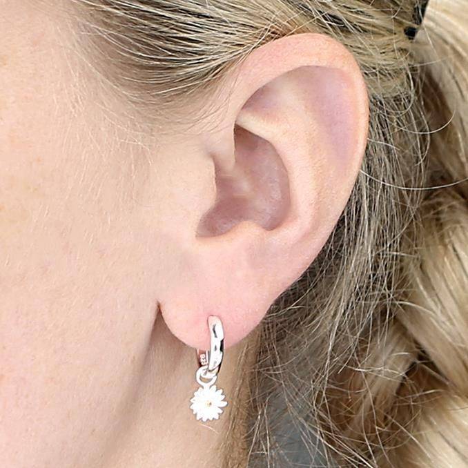Two stone sterling silver and gold plated huggie hoop earrings with a daisy drop charm. 10mm huggie hoop.