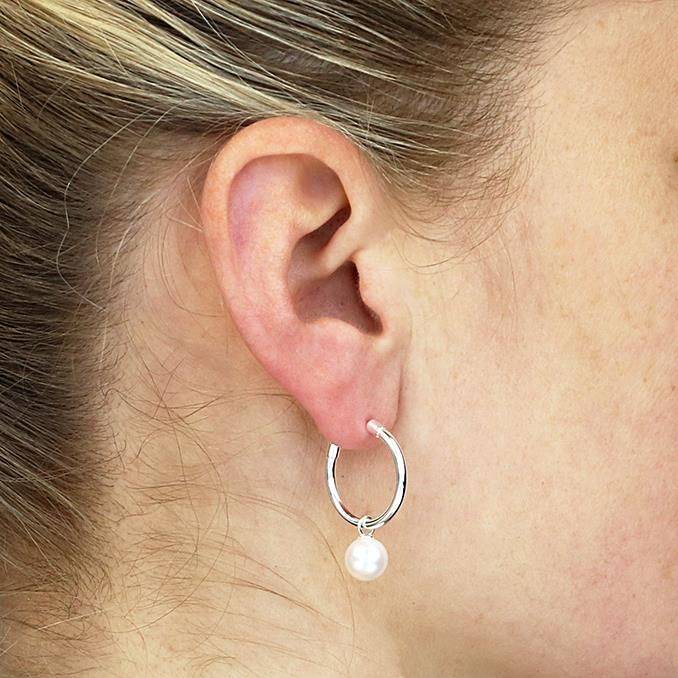 Sterling silver 3/4 hoop earrings with a freshwater pearl charm. 20mm hoops.