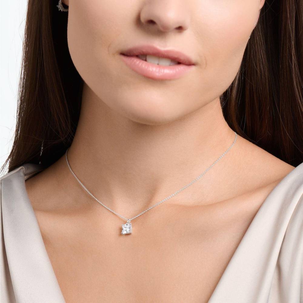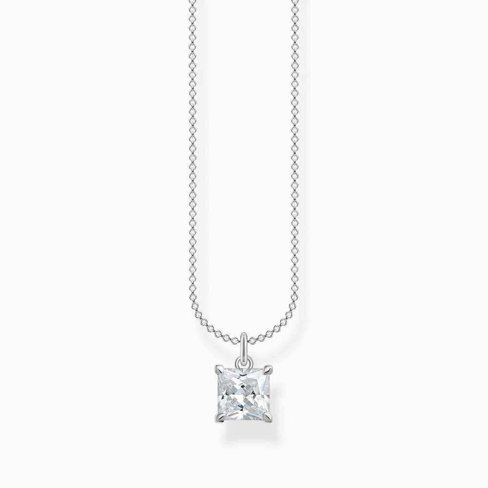 On this necklace with pendant, a white zirconia stone with its intense sparkle attracts everyone’s attention. It is fastened in a claw setting, which is open at the side. The combination of the square princess cut and the open arrangement on floral design on the back ensures that the zirconia stone sparkles extra brightly when light falls onto it. The pendant and necklace are made of high-quality, 925 Sterling silver. Chain length 45cm.