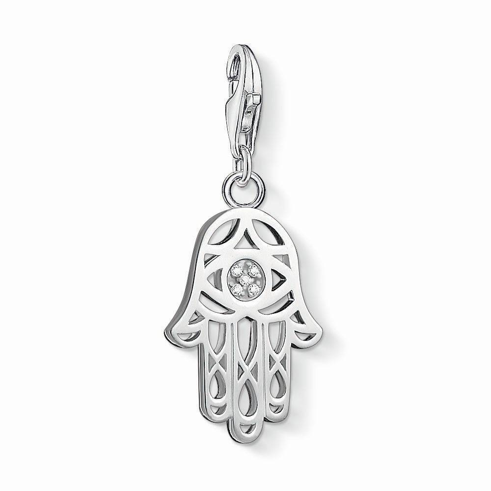 Thomas Sabo Hand of Fatima open work charm set with diamonds in the centre. On the occasion of the 10th anniversary of the Charm Club, the most popular THOMAS SABO Charms are receiving a very special upgrade: white diamonds
