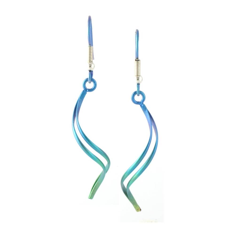 lThese wirework earrings feature a duo of sweeping wave shapes which curl gently around. Each earring is twisted by hand, anodised carefully and maticulously paired by our experienced team.