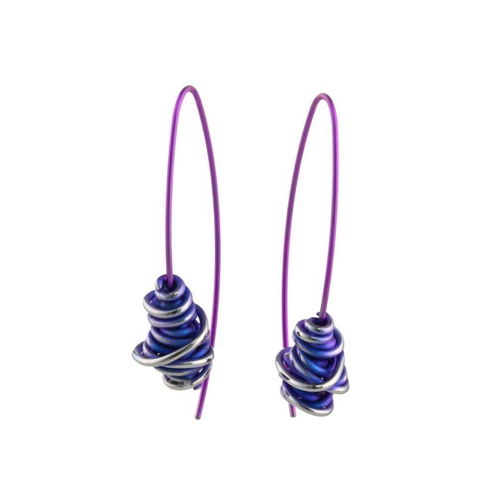 A strong, titanium, drop earring with a fixed ear hook and a stunning chaos bead at the bottom. These 40mm long earrings.