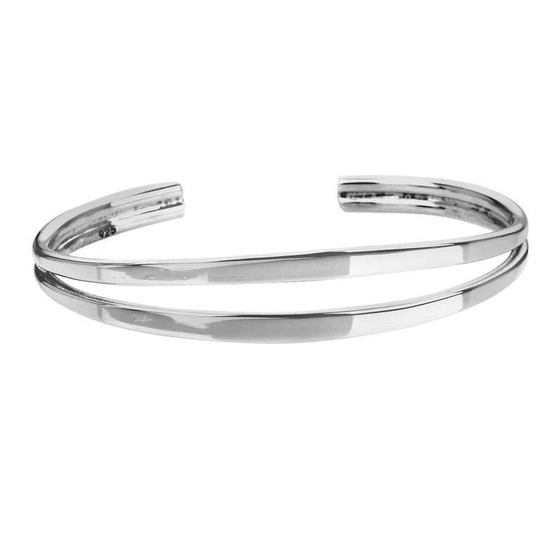 A contemporary sterling silver bangle crafted by Tianguis Jackson who take their inspiration from over a century of Mexico’s silver crafting heritage. The bangle is made up of two fused bands that part in the centre to give the bangle a unique look.