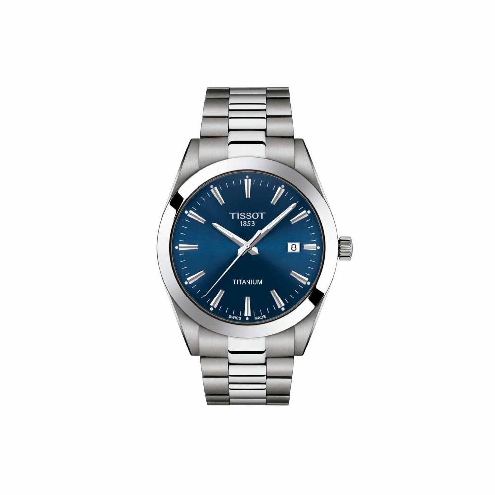 Tissot titanium watch with a round blue baton dial and a date window at 3 o’clock on a titanium bracelet. This watch has a sapphire crystal glass and is powered by a Swiss quartz movment. As this watch is made from titanium it makes it really lightweight and easy to wear. Case 40mm.