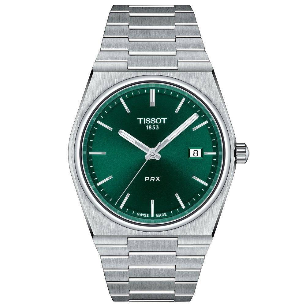 Tissot stainless steel PRX watch with a round green baton dial with a date window on a stainless steel bracelet. Powered by a Swiss quartz movement with a sapphire crystal glass.