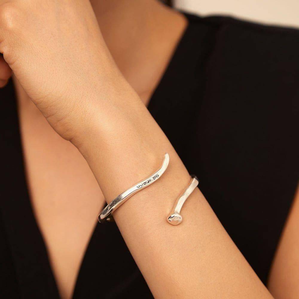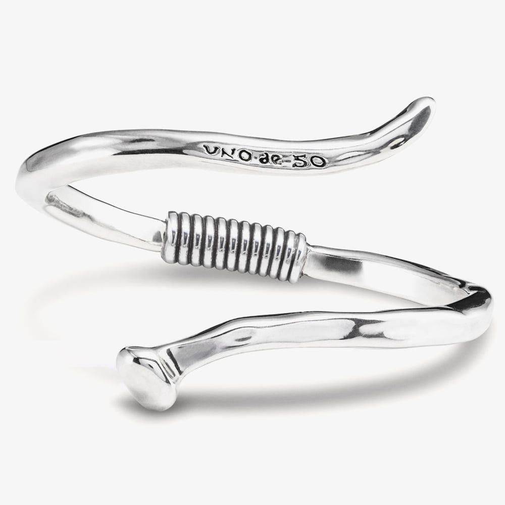 Uno de 50 B12 bracelet, the bangle is modelled as a stylised nail that wraps around the wrist. A lovely feature bangle handmade in Spain using a silver plated alloy.