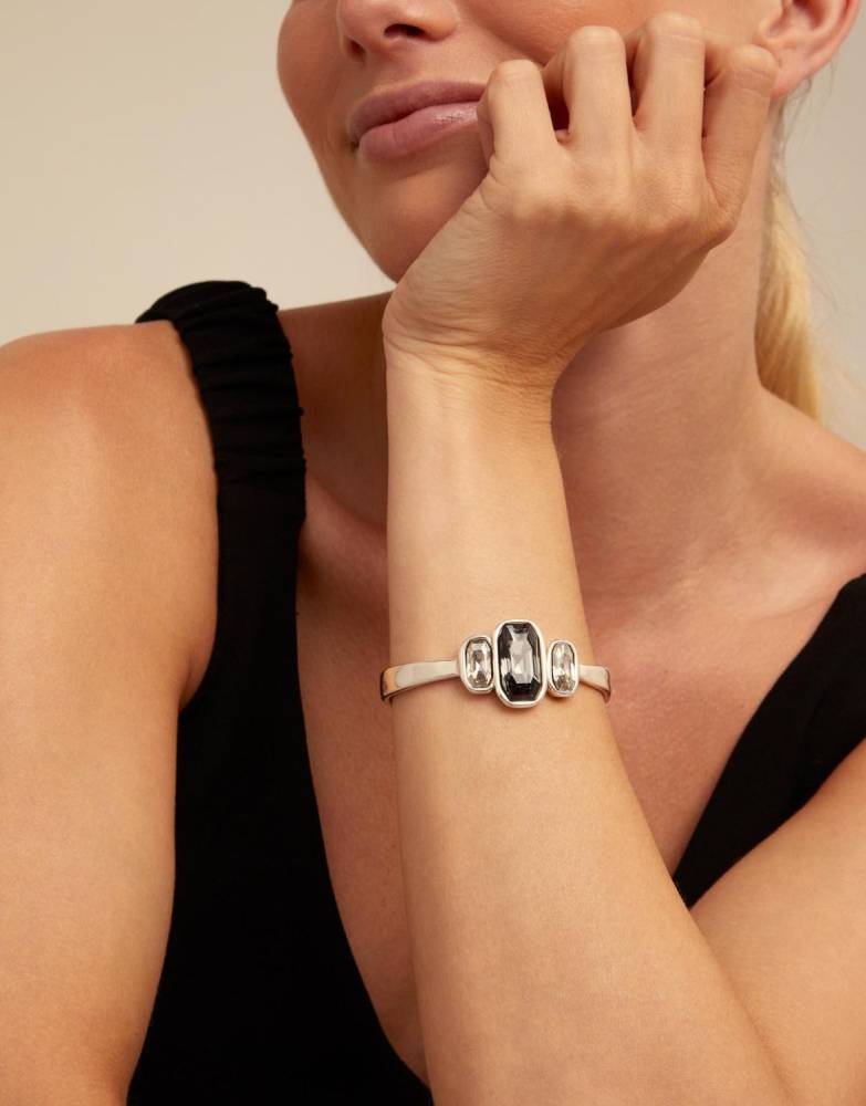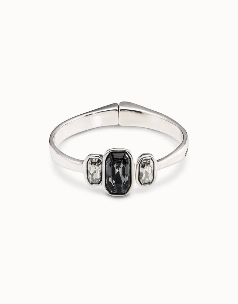 Open bracelet with crystals at each end, a central gray crystal and two white crystals. It has a concealed spring for added convenience. This bracelet is entirely handmade in Spain using a silver-plated metal alloy.