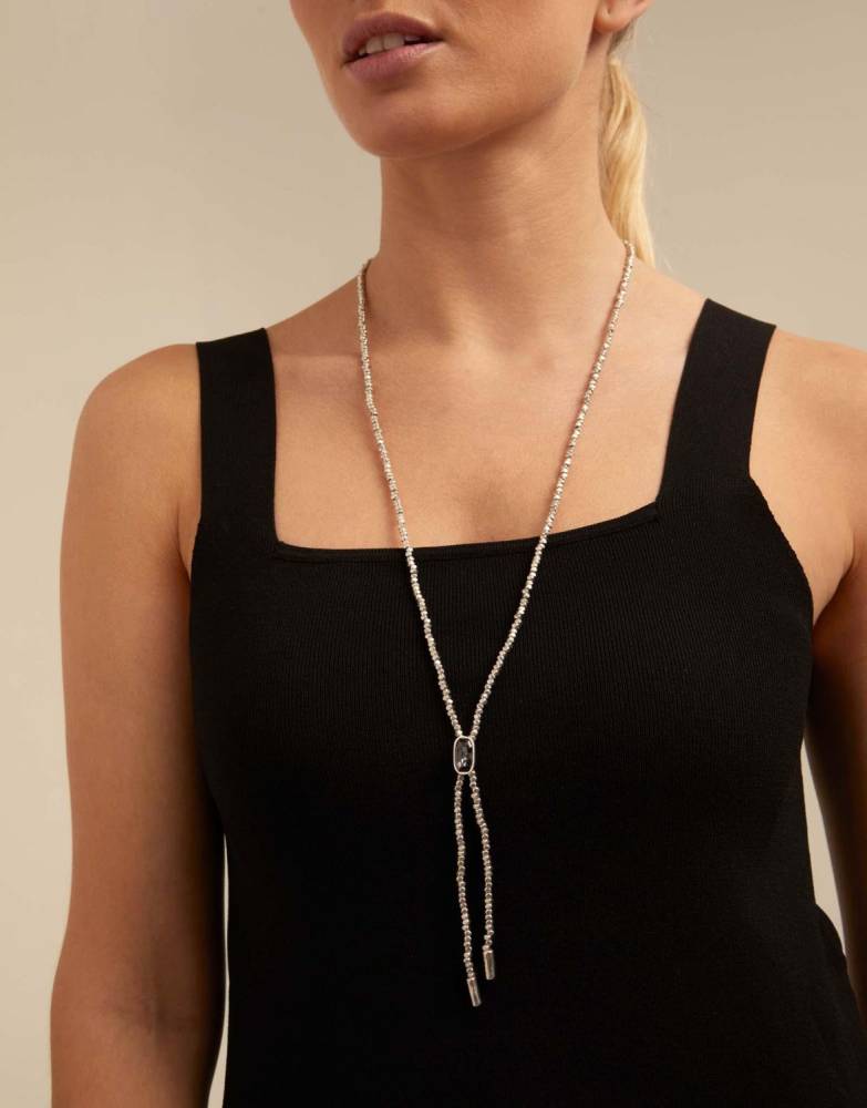 Long whip-shaped necklace featuring small square beads joined with a gray crystal. It features a lobster clasp, allowing you to adjust this piece of jewelry to the desired length. This piece of jewelry was handmade in Spain from a silver-plated metal alloy using an entirely artisan process.Length 88-91cm.