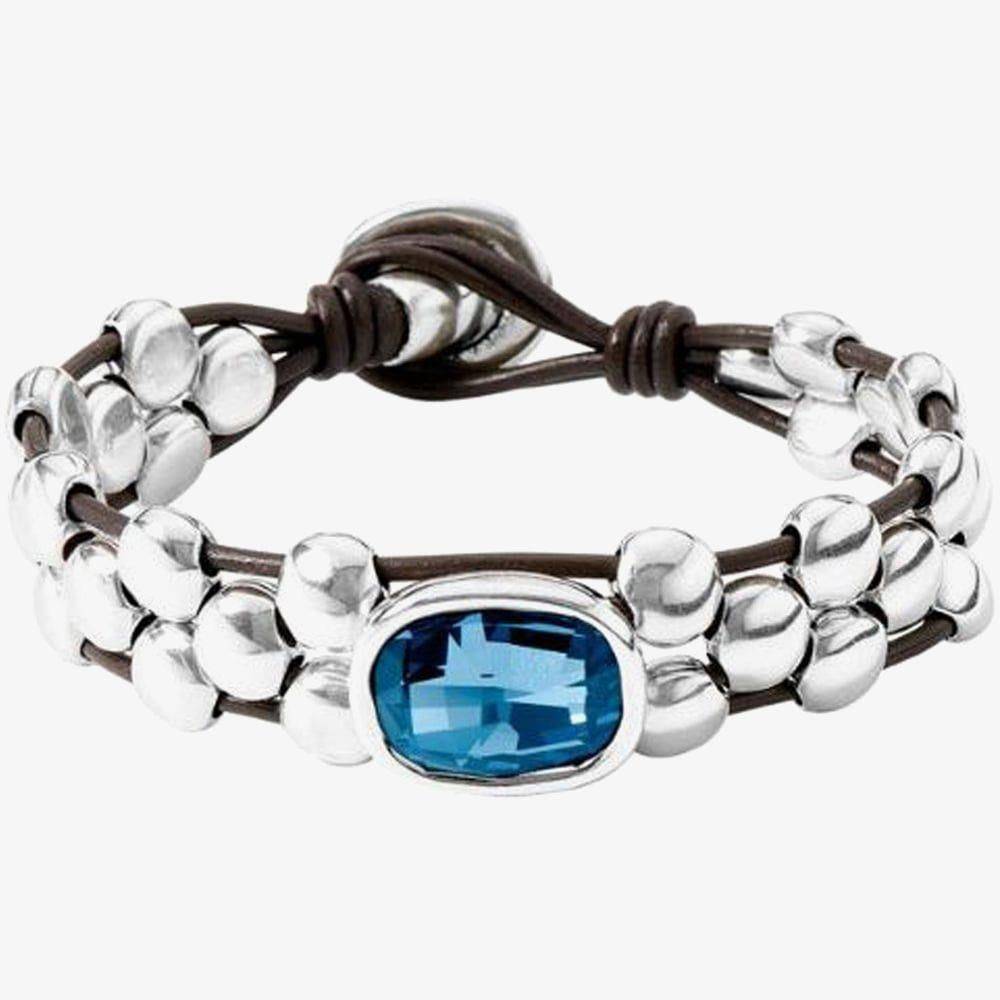 Uno de 50 leather bracelet with three rows of silver plated beads and a central denim blue crystal.
