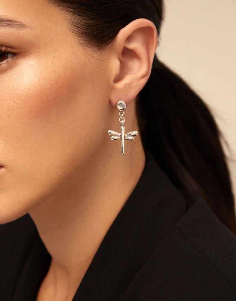 Uno de 50 simple short earrings with an original design in the shape of a dragonfly in silver-plated metal. A jewel that you can wear daily and that will give a special touch to your outfit. A timeless design, made in Spain and 100% handcrafted.