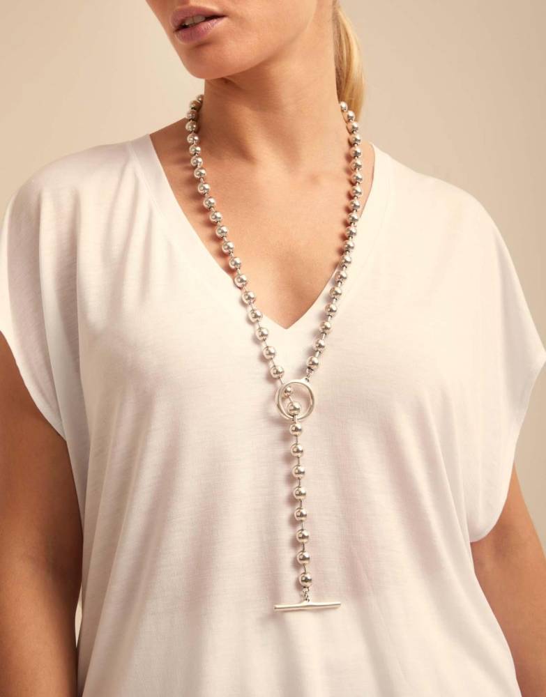 Extraordinary midi necklace, in silver-plated metal. Of simple design, its multiple beads lead to a closure that, in addition to being functional, is ornamental. This closure has a bar and a ring in which our unmistakable logo is engraved. Do not hesitate to wear this unique jewel 100% handcraft made in Spain by UNOde50.