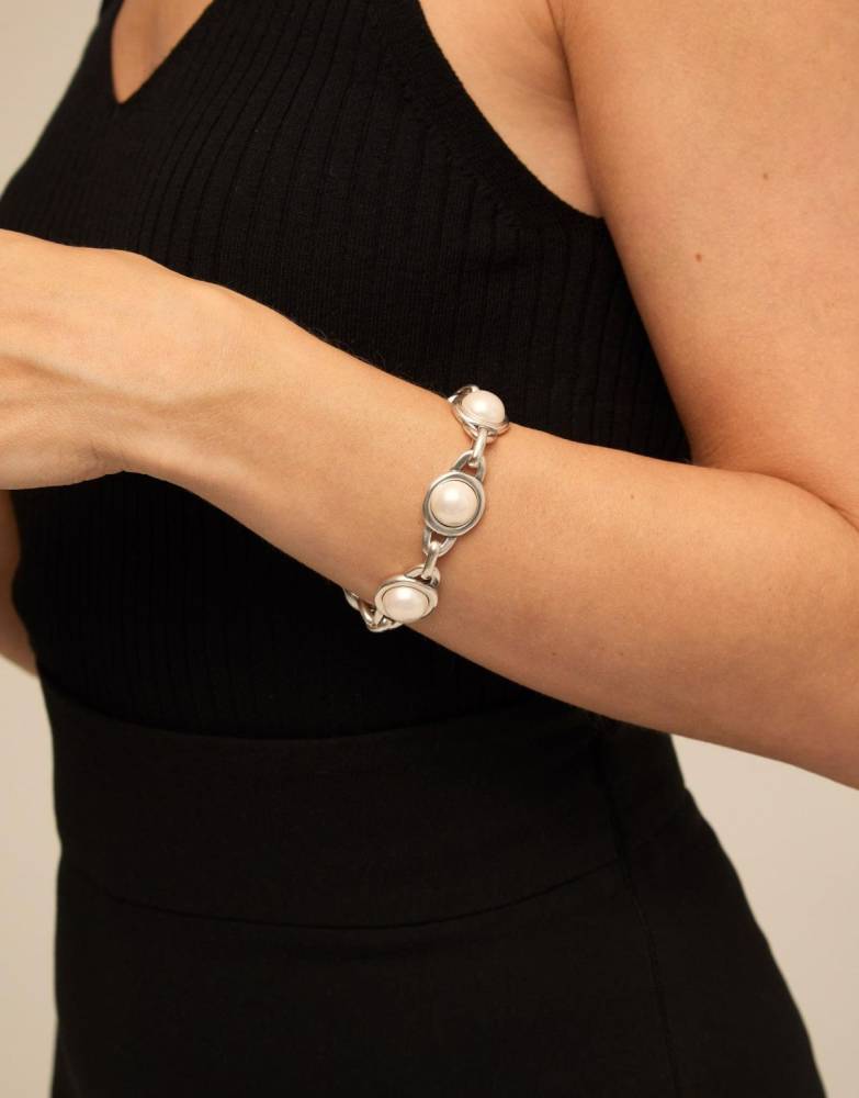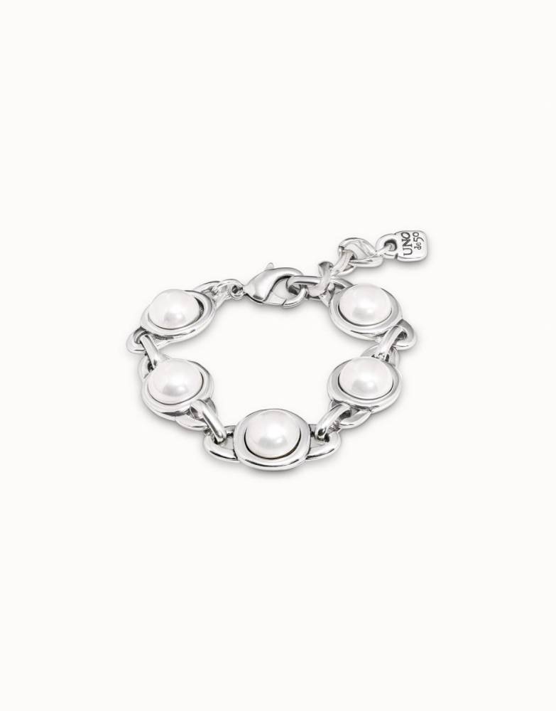 Bracelet with five silver-plated metal pieces, each set with a pearl. It features a lobster clasp. This piece of jewelry was handmade in Spain from a silver-plated metal alloy using a 100% artisan process.