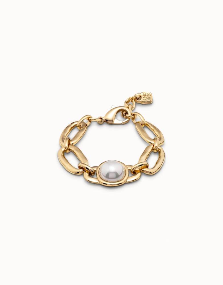 Uno de 50 gold plated oval metal link bracelet with a feature central pearl. Just like all of UNOde50’s jewelry, it is handmade in Spain through a 100% artisanal process and uses a gold-plated metal alloy. Flaunt this one-of-a-kind piece of jewelry and make it a key feature in your collection.