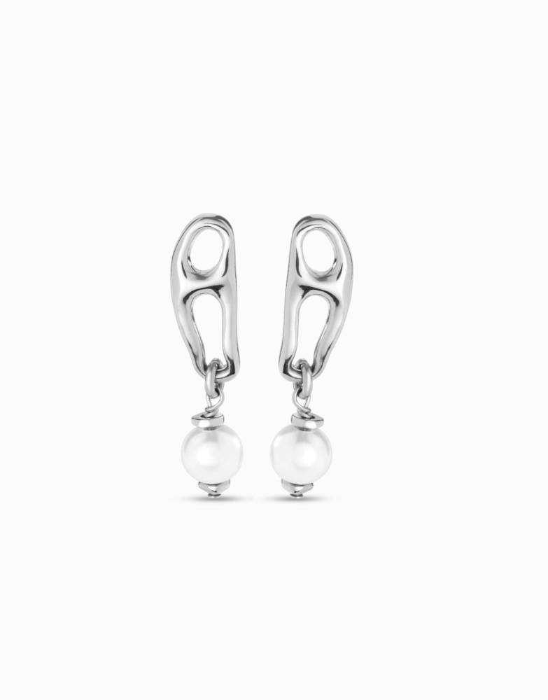 Double link drop earrings with white pearls. The Joyful collection combines different shapes and styles. This allows us to mix and play, to be creative and enjoy every step we take. These earrings are made from a special silver plated alloy and are handcrafted in Spain.