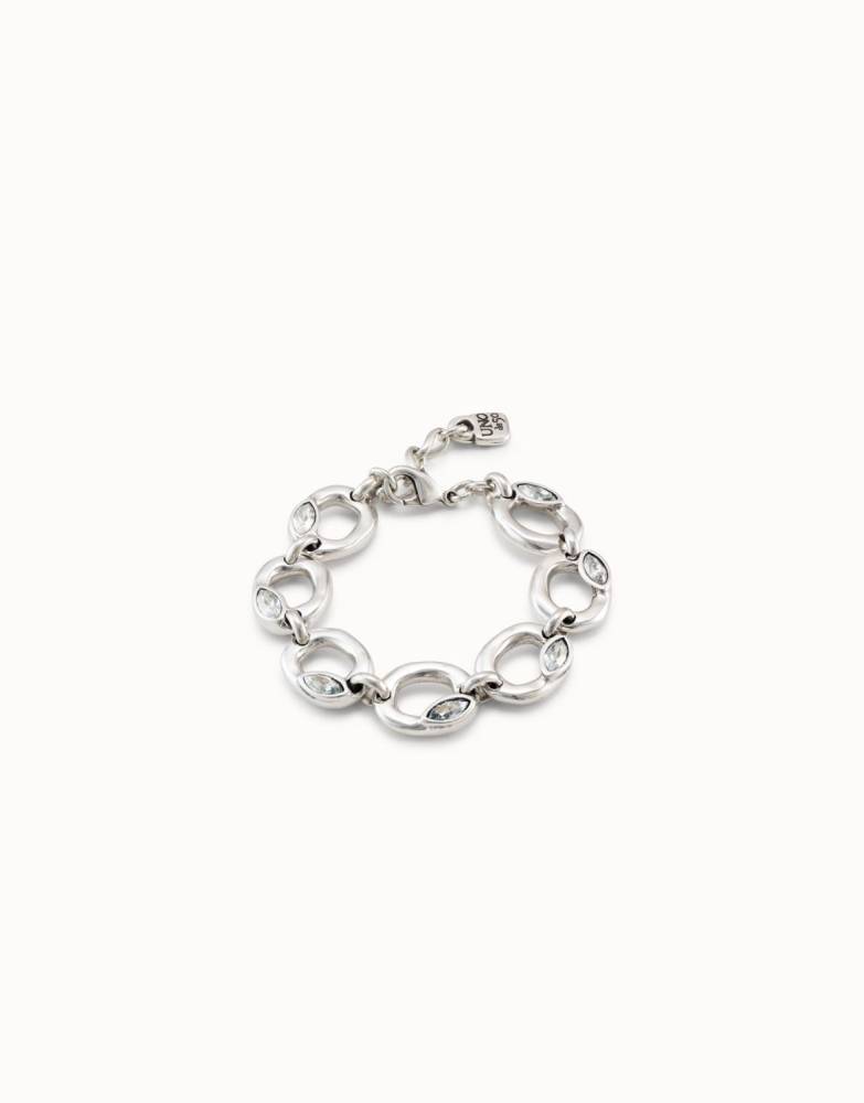 This bracelet features a design of oval-shaped beads, each with a small faceted silver-gray crystal. Its carabiner clasp allows the bracelet to be adjusted to the desired size. Entirely handmade in Spain. The Grateful collection symbolizes a subtle and sophisticated feeling. Focus on the good things in life and feel grateful for what you have. A feeling transferred to metal and crystal, in organic jewelry full of life.