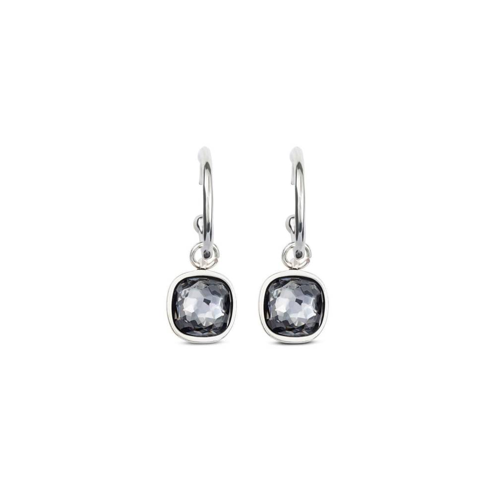 Uno de 50 shiny tears drop earrings each featuring a grey cuhsion shaped crystal. These earrings are handcrafted in Spain using a silver plated alloy.