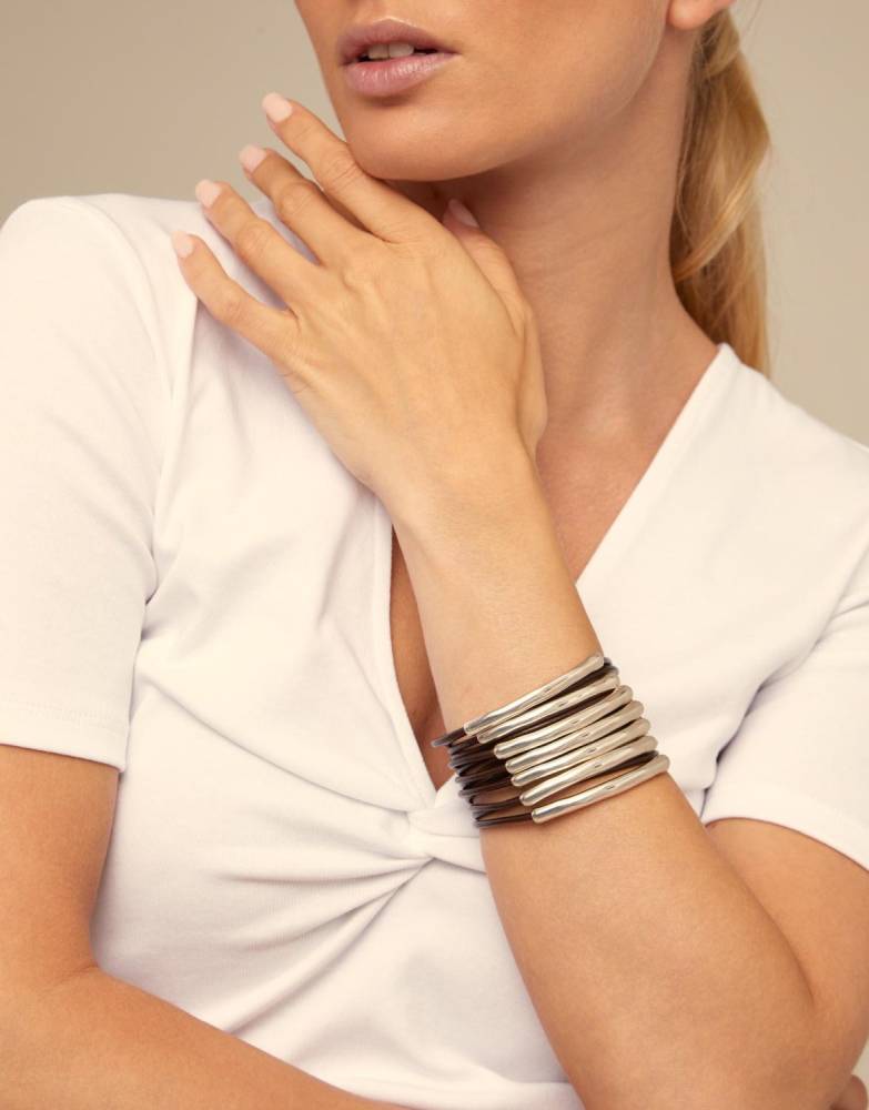 Bracelet with some leather lace turns in a dark brown tone with a curved silver plated tubular metal piece in each of them. Its metal lock has a unique hinge design, which provides an industrial nature and joins the bohemian spirit of the jewel.