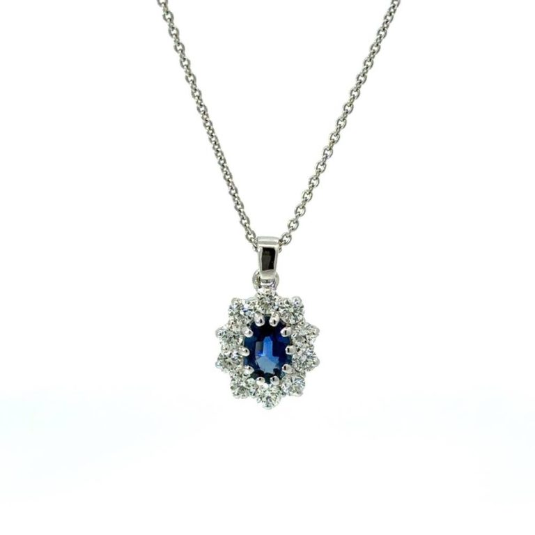 18ct White Gold Oval Sapphire & Diamond Cluster Pendant