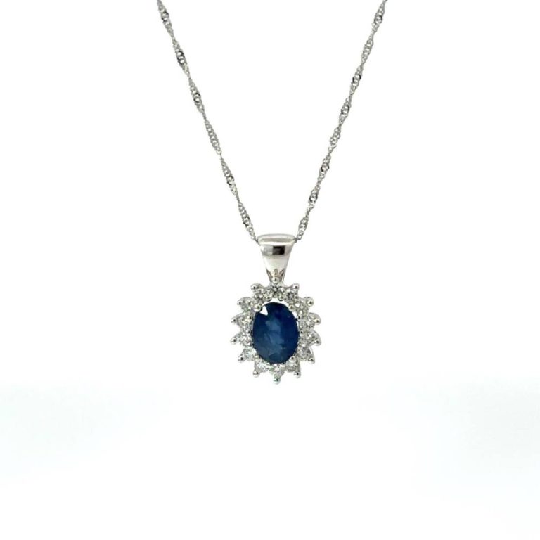 18ct White Gold Oval Blue Sapphire & Diamond Cluster Pendant