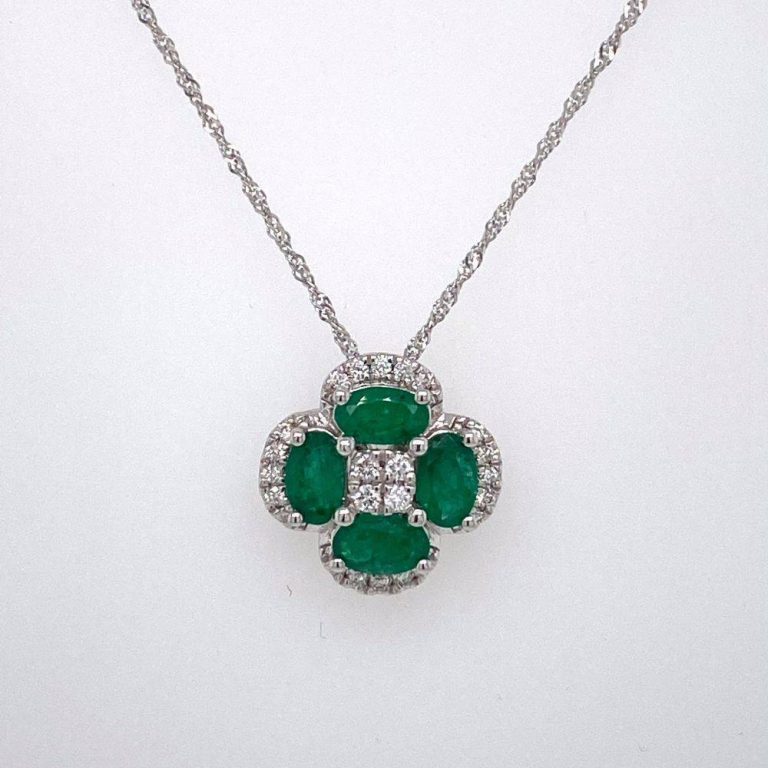 18ct White Gold Four Leaf Emerald & Diamond Pendant